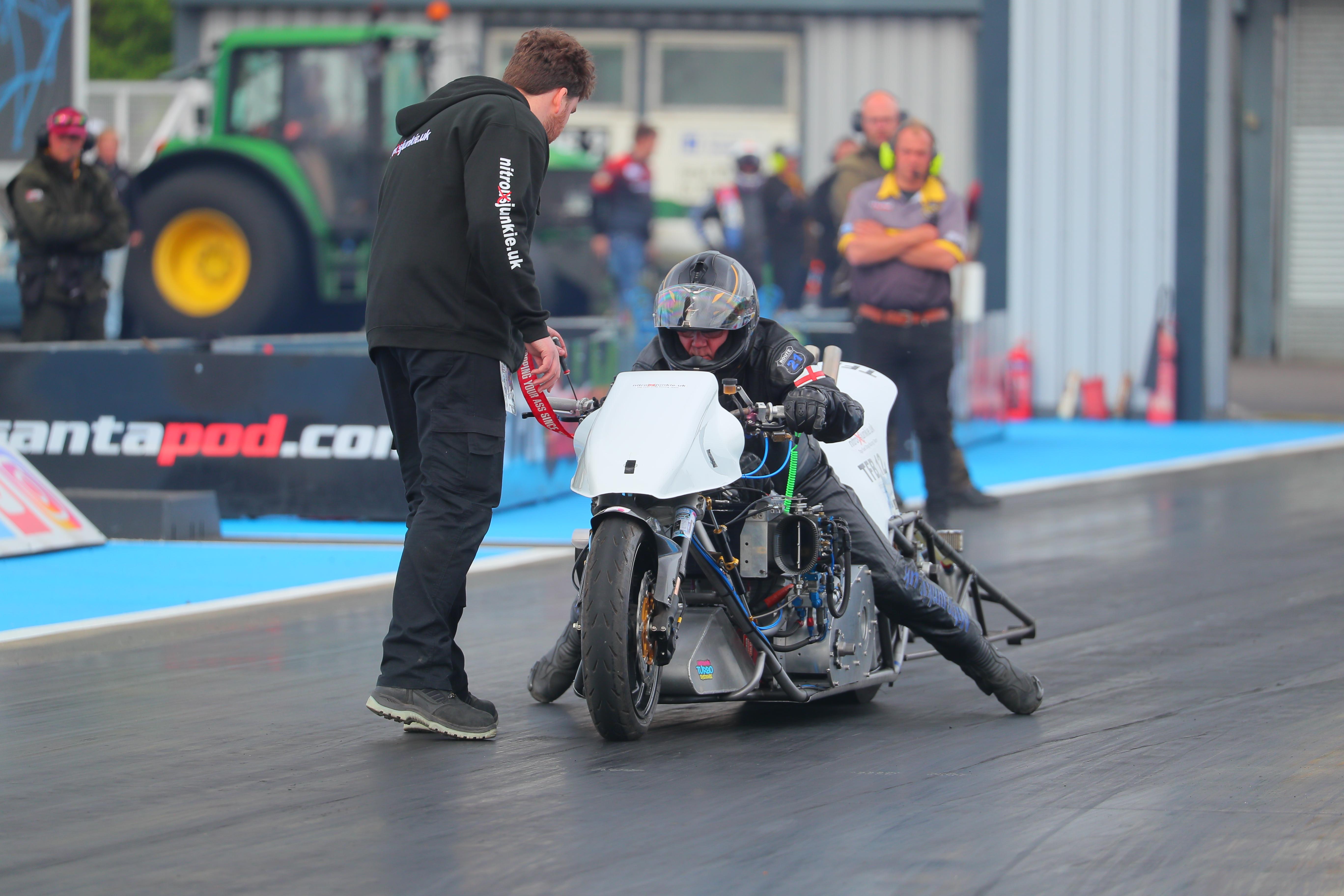 Friday morning, we ran into a bit of nitro mischief. Even though the bike had sounded great just two weeks earlier, it now didn’t want to idle properly. We took our time resetting the barrel valve and idle settings. We weren’t in a rush to make the first qualifier - this is about testing, not chasing points (yet). We also got some excellent advice from seasoned friends in the paddock, including multiple European champion Ian King. We're truly grateful for everyone's help and encouragement.