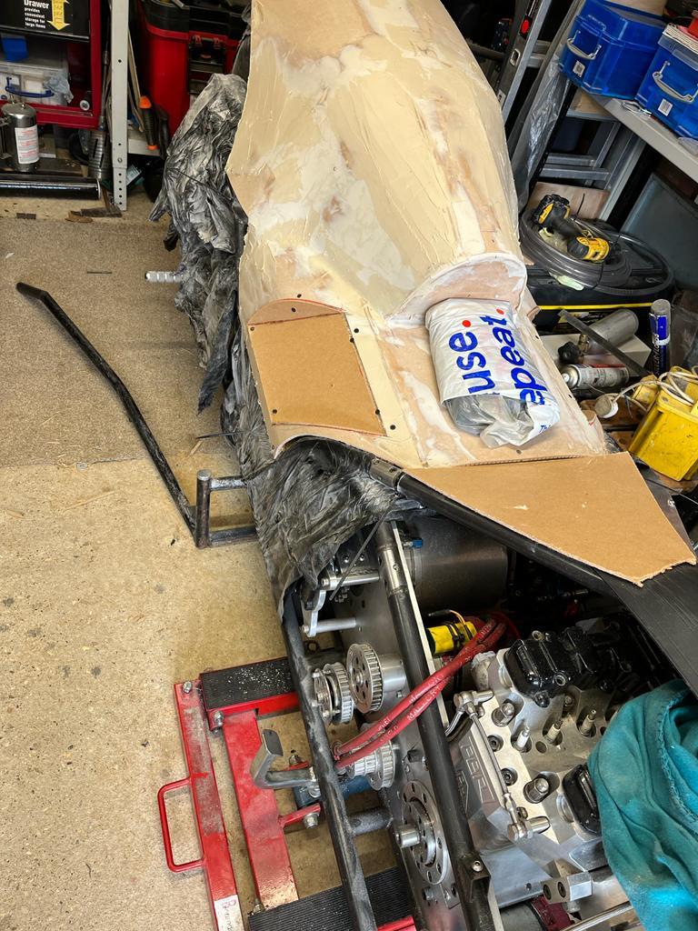 Kev decided to try to make the body work himself, after all how hard can it be (!?) He soon found out. He made a wood and car filler plug, waxed and polished and polished some more, and made a fibre glass a mould off it and left it to cure for a few days. Then came the butt clenching moment of removing the body from the mould. The cracking noises that this made was concerning, but happily we had a mould, and it was in one piece!! Duly waxed and polished some more, and going back to the fibre glassing and stinking of resin, the body shell was made.
