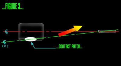 In Fig-3.. I have drawn a top view of what happens when you lean a bike to the right. As you lean the bike over to the right, the contact patch moves out to the edge of the tire, driving the bike to the left... I always tell the new riders to go and ride a one of those off road 3 wheelers because a big tire drag bike handles much the same way...You have to lean them to the right to make a left turn. When you make a left turn, What you are actually doing is pushing down with your right foot ( to load the right tire) and leaning your upper body to the left to control how high the left tire comes up. A big tire drag bike is like a three wheeler with narrow rear wheels.....
